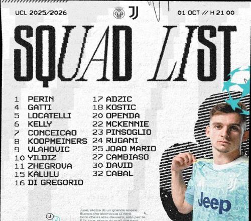 尤文图斯官方公布了欧冠联赛阶段第二轮客场对阵比利亚雷亚尔的比赛大名单,伊尔迪兹领衔,布雷默、凯夫伦-图拉姆缺席。