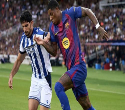 雷速体育10月5报道 西甲第8轮,巴塞罗那客场对阵塞维利亚。上半场补时阶段,拉什福德为巴萨扳回一城,打入个人西甲首粒进球。