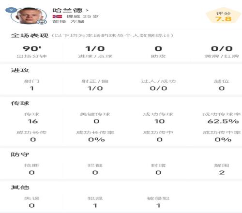此役哈兰德首发并踢满全场,打入全场唯一进球,全场比赛哈兰德只贡献了1脚射门,就收获进球,16次传球,成功率62.5%,防守端贡献2次解围,赛后机器评分7.8分。