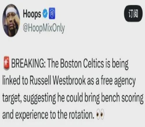 据美媒Hoops报道,凯尔特人有意在自由市场签下威少。
