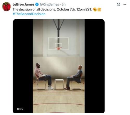 今天,洛杉矶湖人队的老将詹姆斯突然更新个人社媒账号,放出了一段短视频,并且附文道:“决定中的决定,10月7日,美国东部时间中午12点。”