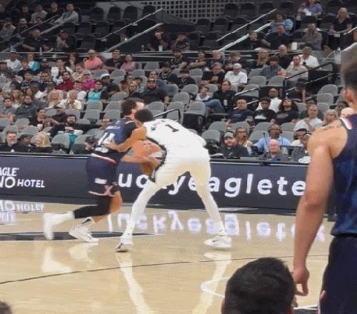 管子煜进攻前摇,运球突破都做得挺不错,可惜马刺最后一道屏障——文班亚马,实在是太变态了,直接一掌大帽拒之门外。