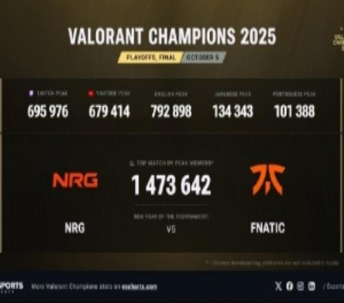 电竞体育10月8报道 据国外Esports Charts数据网站统计,瓦罗兰特巴黎全球总决赛的峰值观众为147w,不及CS2 Major和英雄联盟MSI。