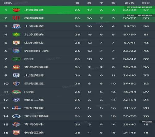 北京时间10月7日,随着三场补赛的结束,目前的中超所有球队都已经踢完了26场比赛,争冠和保级逐渐明朗,其中争冠的是海港57分,蓉城55分,申花54分。为保级而战的球队是梅州客家,深圳新鹏城(20分)、青岛海牛和长春亚泰(18分)!