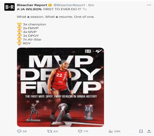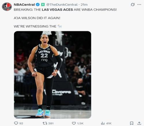 美媒NBACentral写道:王牌拿到了WNBA总冠军,威尔逊成为FMVP,我们正在见证GOAT。