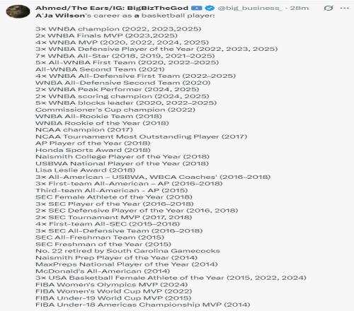 美媒晒出威尔逊从U18系列开始拿下的荣誉,2014-2025年这11年里威尔逊一人斩获了41项荣誉,她跟勒布朗一样是行走的荣誉产生器。