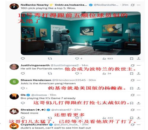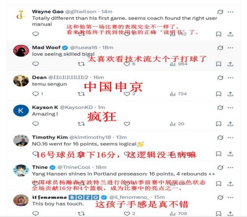 有球迷表示杨瀚森是中国申京,还有说杨瀚森是波特兰救世主,约基奇是美国版杨瀚森,16顺位打得和前5顺位球员似的,详情请看图片的中文翻译。