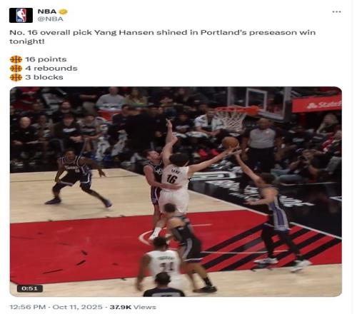 雷速体育10月11报道 NBA季前赛继续进行开拓者124-123击败了国王,中国球员杨瀚森第三节单节5投全中得到了14分,全场比赛8投5中拿到了16分4个篮板3次盖帽,赛后NBA官推发布了杨瀚森的比赛集锦,大量球迷发布评论感叹杨瀚森表现出色。
