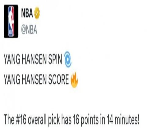 其中NBA官方第一时间发文,他们表示:杨瀚森火力全开,16顺位新秀在14分钟内狂砍16分!这样的话语就证明了杨瀚森在这场比赛的震撼程度。别忘了,这样的得分已经超过了夏季联赛,他对于NBA的适应越来越好,而且实力也在保持实质性的提升。