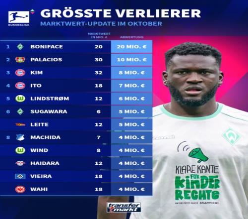 雷速体育10月14报道 德国转会市场更新了德甲球员身价,并列出了更新后的德甲球员身价跌幅排行榜,目前租借加盟不莱梅的药厂中锋博尼法斯以2000万欧跌幅位列第一。