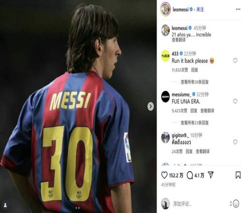 雷速体育10月17报道 阿根廷球星梅西在个人社媒上晒出了自己在21年前身披巴萨球衣上演职业生涯首秀的照片,在短短半小时内就收获了百万点赞,目前已收获超150万点赞。