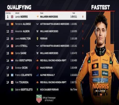 诺里斯在二三段刷紫,但因在1号弯前轮锁死导致损失0.89秒,排在第10;