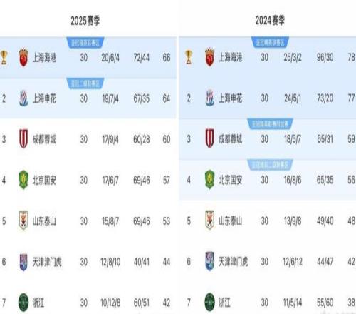 不少球迷肯定也看到,2024赛季和2025赛季中超前7名的排名完全一致,再仔细看今年冠军的积分比去年少了12分(上图)。这意味着,相比去年,今年的中超水平又下降了。这种情况下,依然比较舍得花钱,也有钱可花的上港再次夺冠就不奇怪了。